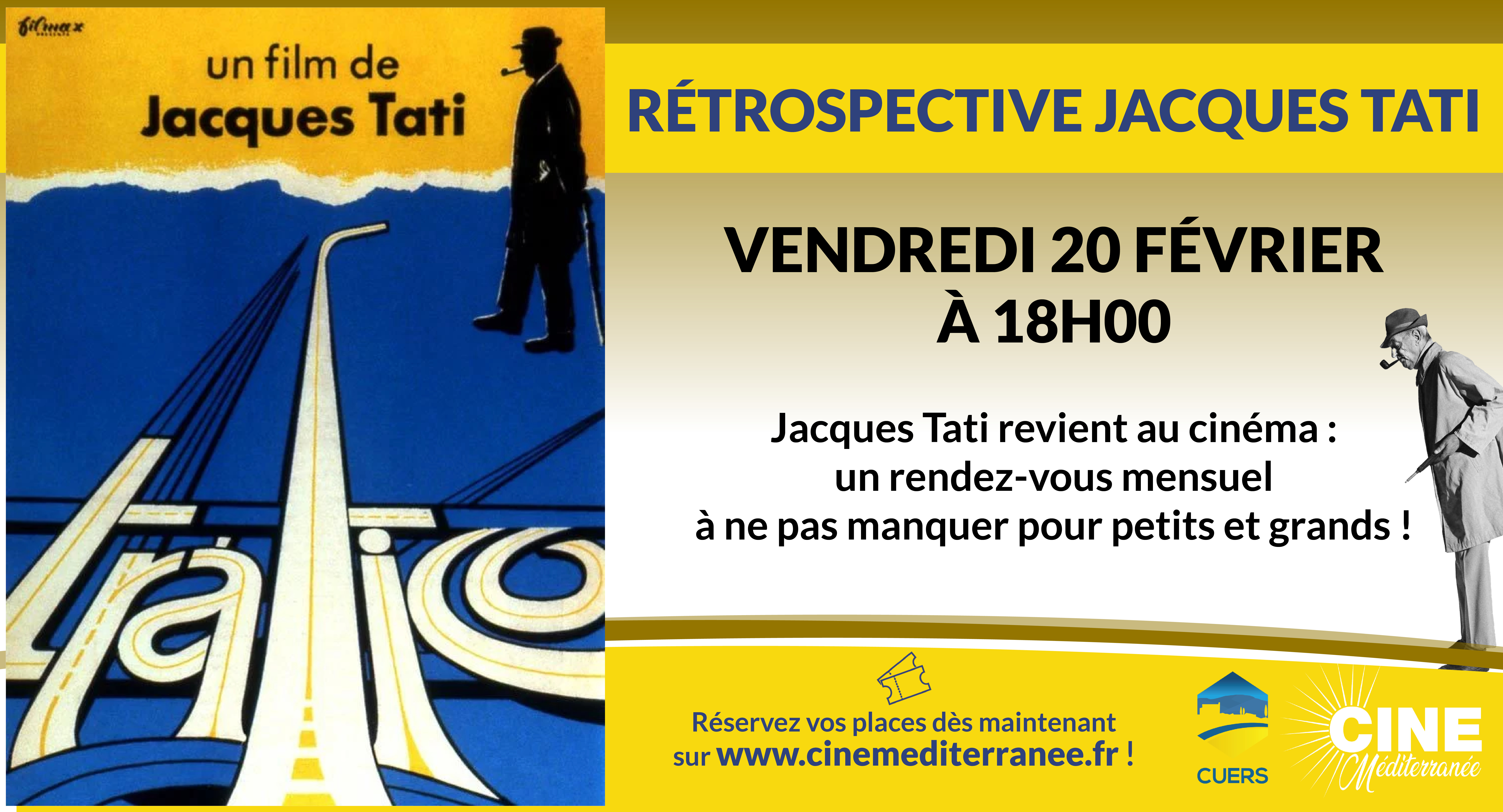🎬 Rétrospective Jacques Tati à l’Espace Serge Martina – CuersDe septembre 2024 à mars 2026, le cinéma Espace Serge Martina vous propose un rendez-vous exceptionnel : une rétrospective intégrale des films de Jacques Tati, l’un des plus grands maîtres du comique et de la poésie au cinéma.Chaque mois, (re)découvrez sur grand écran un film culte, de Jour de fête à Playtime, en passant par Les Vacances de Monsieur Hulot ou Mon Oncle. Un véritable voyage dans l’univers tendre, drôle et visionnaire de Tati, qui continue d’inspirer des générations entières de spectateurs.📅 Un film par mois, jusqu’en mars 2026 : l’occasion idéale de savourer la fantaisie et la modernité de ce génie du cinéma français, en famille ou entre amis.